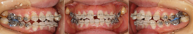 ブラケットを部分的(上顎前歯部と両側第一大臼歯)に装着し、そこから埋伏していた歯を7ヶ月牽引しました。